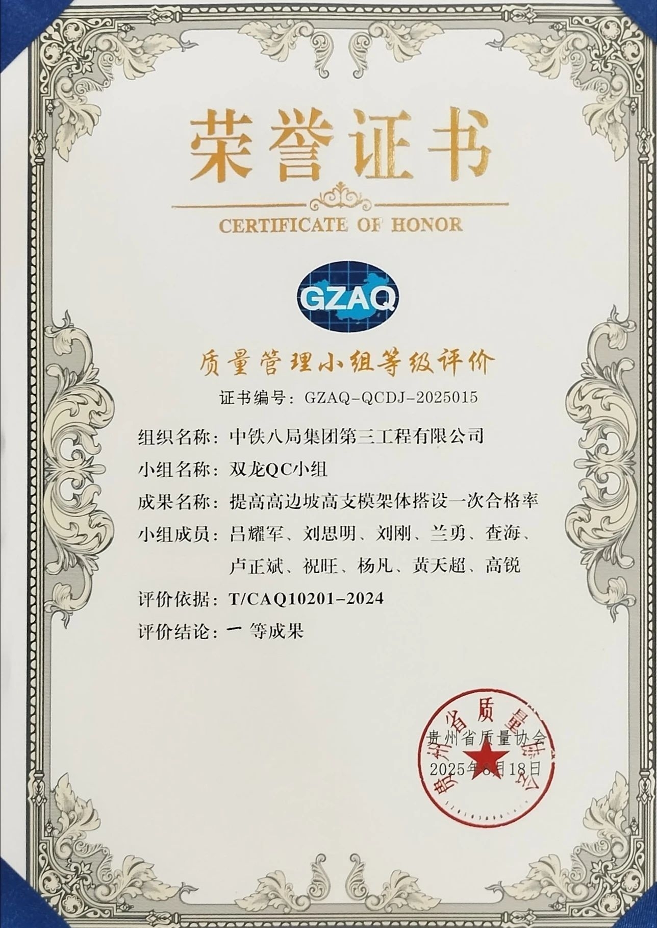 经过激烈角逐与严格评审,公司贵州双龙产业园项目申报的《提高高边坡高支模架体搭设一次合格率》QC成果,凭借显著的技术创新性、扎实的数据支撑、突出的经济效益及广泛的行业示范价值,在众多成果中脱颖而出,荣获一等成果评价,并成功取得晋级全国赛事的资格。