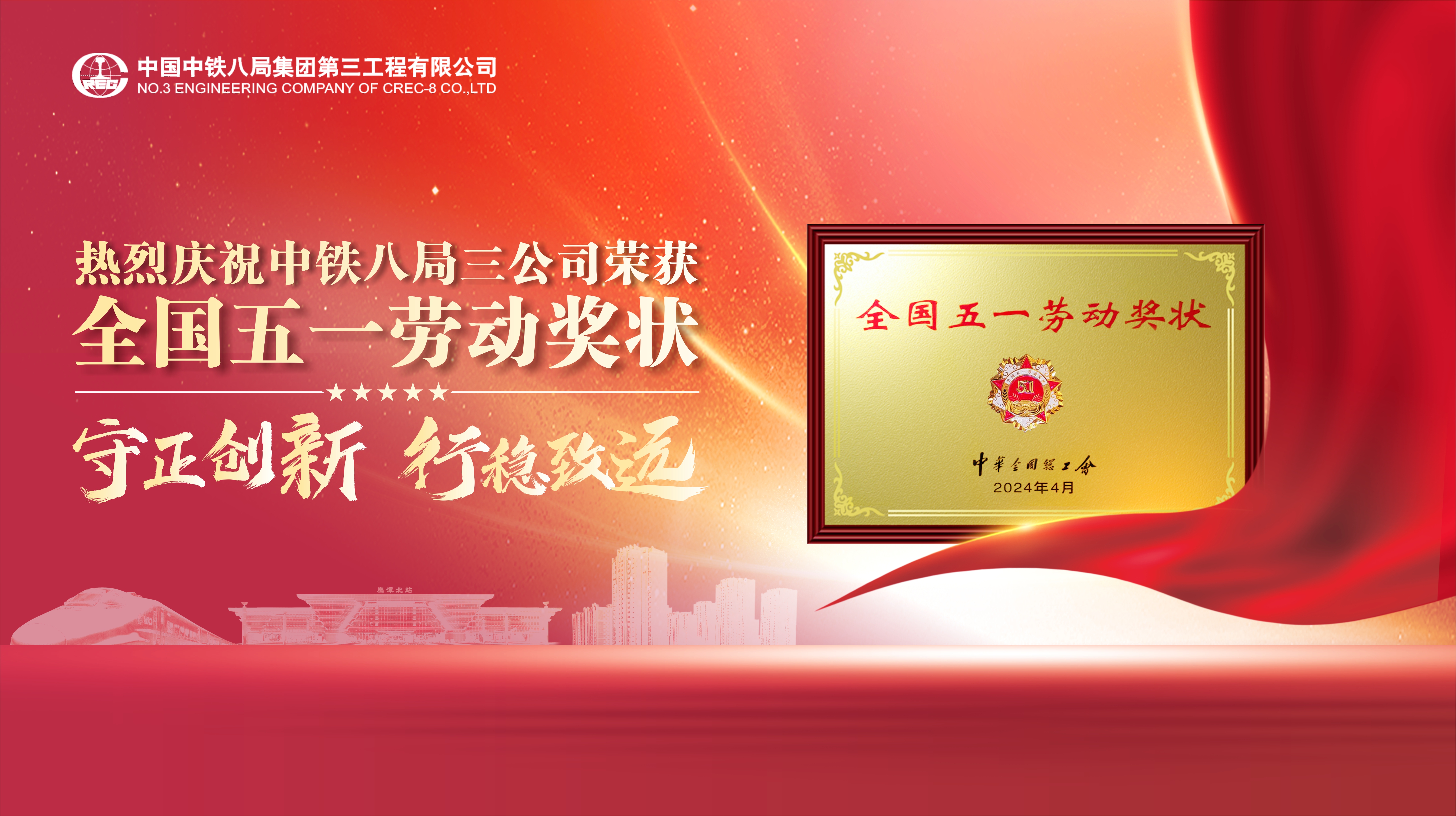 会上传来喜讯,中铁八局集团第三工程有限公司被中华全国总工会授予“全国五一劳动奖状”,成为中国中铁百余家三级企业中唯一获此荣誉的单位,这也是中铁八局全集团范围内首个获得该项国家级荣誉的三级工程公司。