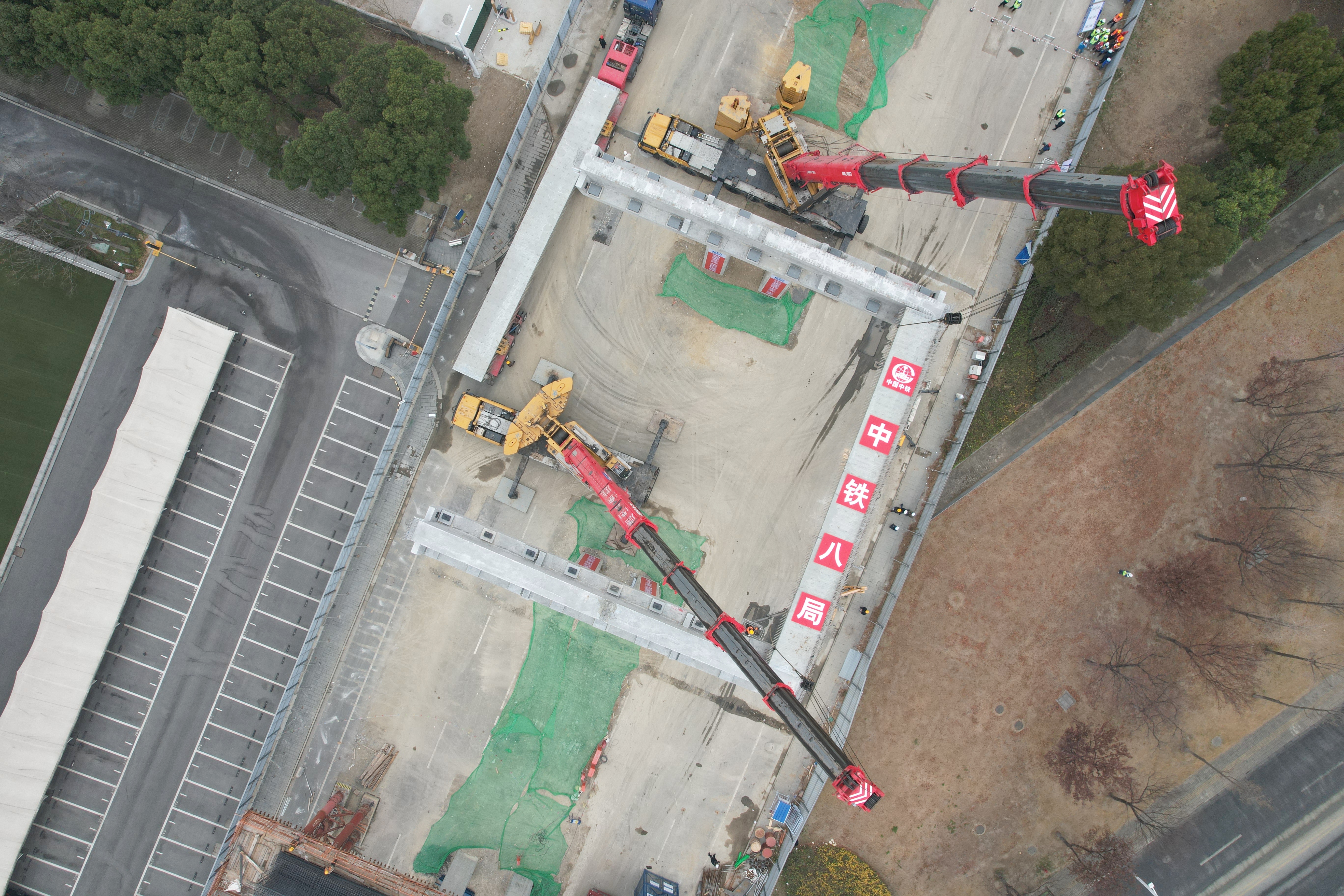 全线共需架设箱梁849榀,此次完成的首榀箱梁,位于第一段高架桥主线第五联12号-13号墩位,该段落共设箱梁9榀,其中边梁单重90.34吨,中梁单重85.49吨,吊装跨度大、吨位重,对设备性能、施工精度及安全管控均提出严格要求。为确保首榀箱梁顺利架设,项目团队提前筹划,编制专项吊装方案并组织专家论证,最终确定采用双机抬吊工艺。施工前,团队对运输路线、吊装站位及协同步骤进行详细推演,对所有作业人员开展安全技术交底与实操培训,强化安全质量管控,优化工序衔接流程,确保首榀箱梁架设安全顺利完成。