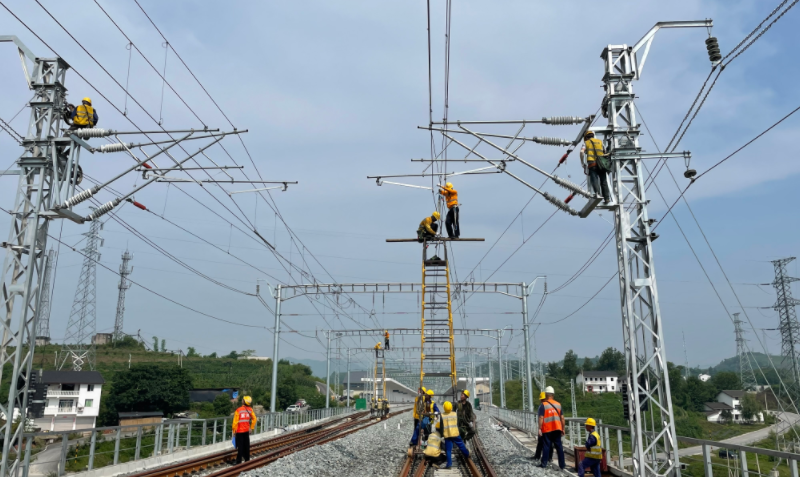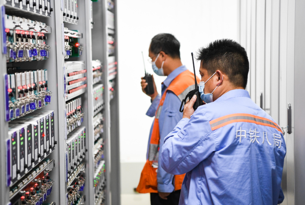 为提升隧道内接触网槽道几何参数的精确度,项目部创新利用全站仪和激光测距仪配合测量,既能够高速测量吊柱、锚臂任意位置距地面的垂直高度,又能测量其距线路中心的水平距离,成功将隧道内测量误差缩小至毫米级。庙坝站至果园港站电缆敷设遇到放缆必经之路的一段桥梁未铺桥面的难题。项目部花一个多月时间在15米高桥墩上,用钢筋搭建了电缆沟槽,成功完成电缆敷设任务,为两站开通提供了电力保障。而电力专业更是用一座小箱变,体现多处大创新,不仅对以往箱式变电站基础进行优化,还将箱式变电站单独远动调试升级为在具有通信通道和供电的龙盛站集中调试,在克服现场点多线长、交通不便等困境的同时,进一步破解了一直以来远动通道及箱变送电互相牵制影响的“死循环”。