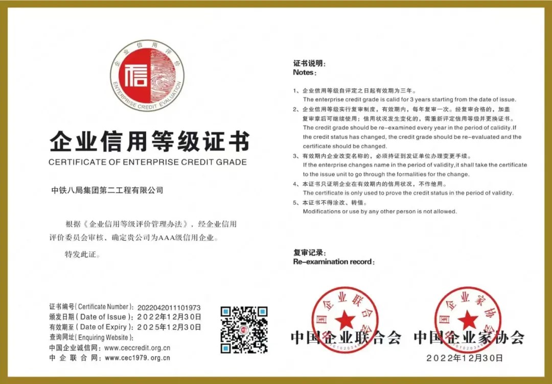 2023年1月5日,从中国企业联合会、中国企业家协会获悉,中铁八局二公司获评“企业信用评价AAA级信用企业”称号。据了解,“企业信用评价AAA级信用企业”是中国企业联合会对全国企业信用能力的最高评价,主要考察企业综合实力、经营能力、财税营收、信用记录、管理目标、竞争指数等,旨在推动企业诚信经营、规范市场行为,履行社会责任,切实提高工程质量和安全管理水平,促进企业持续健康发展。