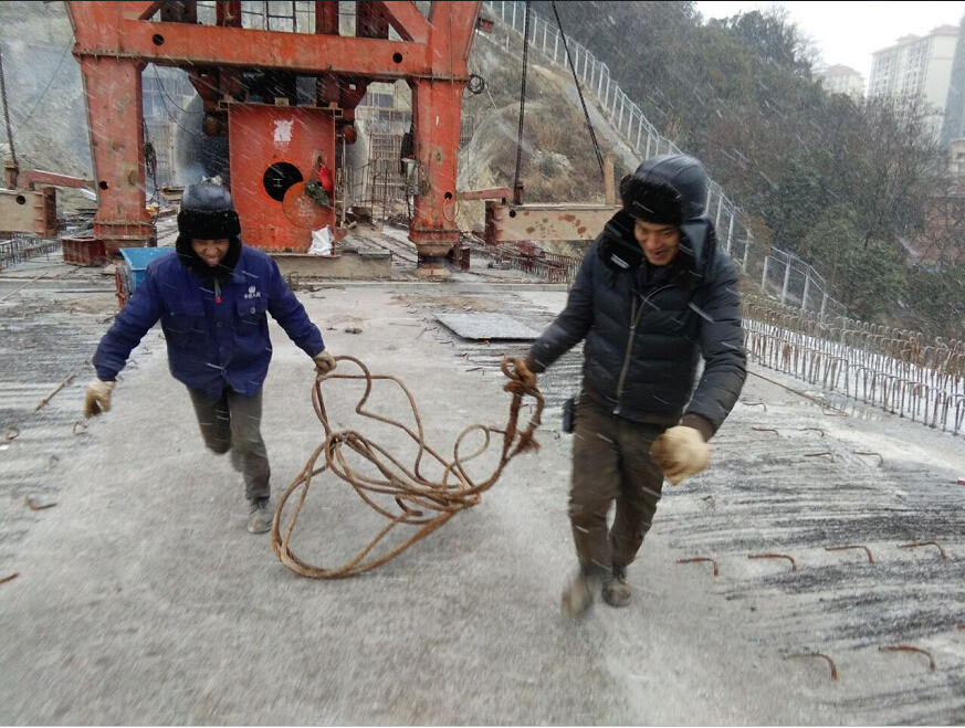 2015年11月,已然隆冬,位于山川之中的架桥作业现场更是寒风凛冽,风起时如刀般刮着脸庞。年轻的小伙们不畏寒风刺骨,仍然坚守在作业现场。因为他们心中有一份责任,有一颗坚决完成任务的信心和决心。