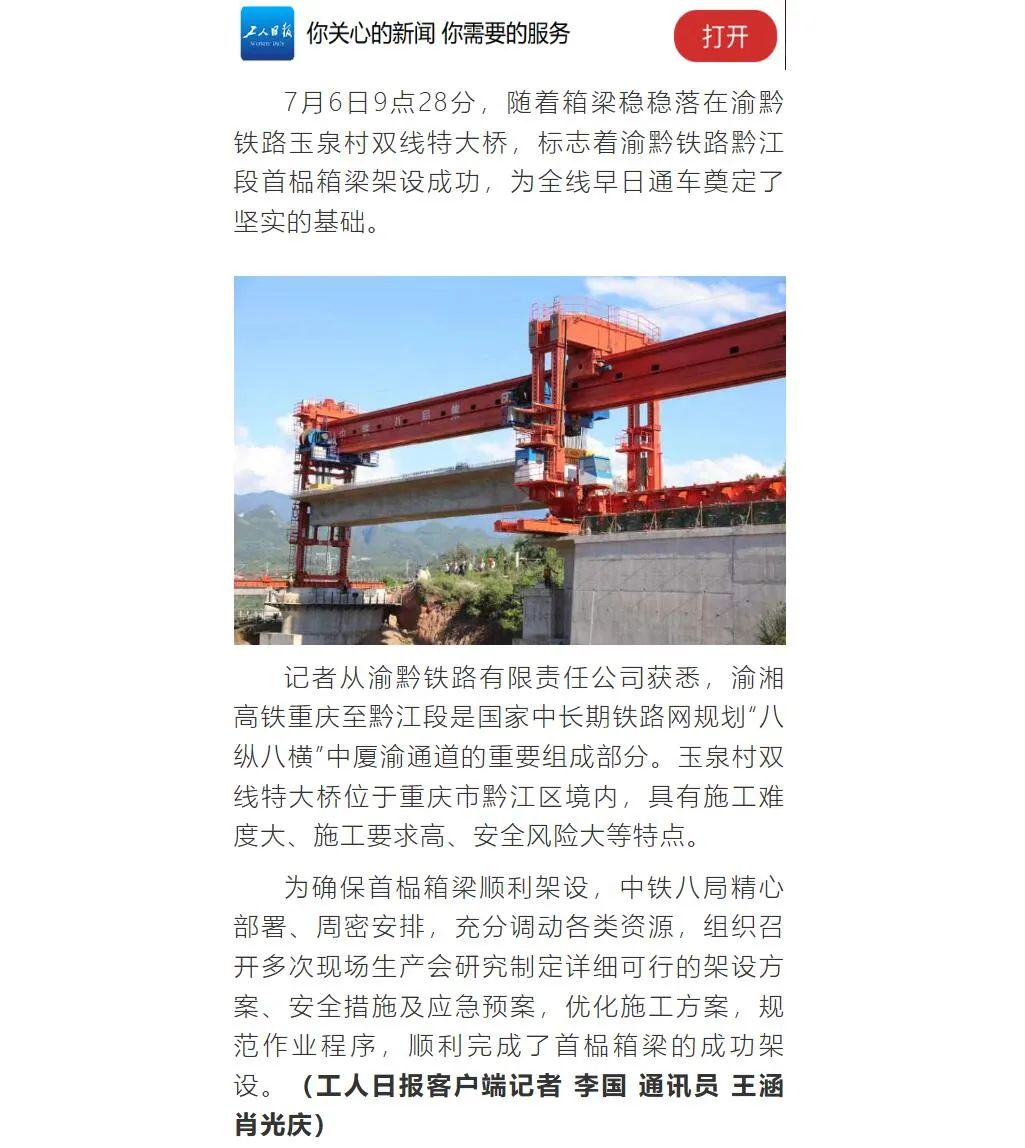 7月6日9时28分,随着首孔长32.6米、重达450吨的箱梁稳稳落在渝黔铁路玉泉村双线特大桥,由中铁八局参建的渝黔铁路黔江段首榀箱梁架设成功,为全线早日通车奠定了坚实的基础。