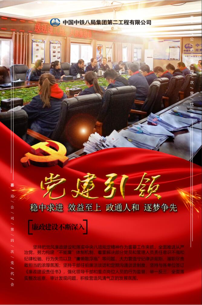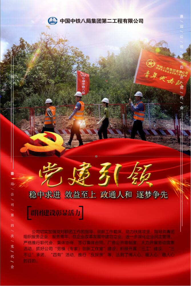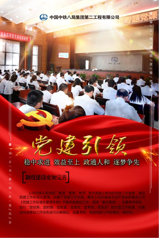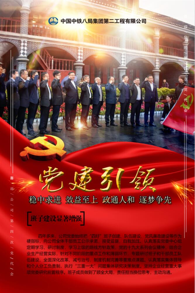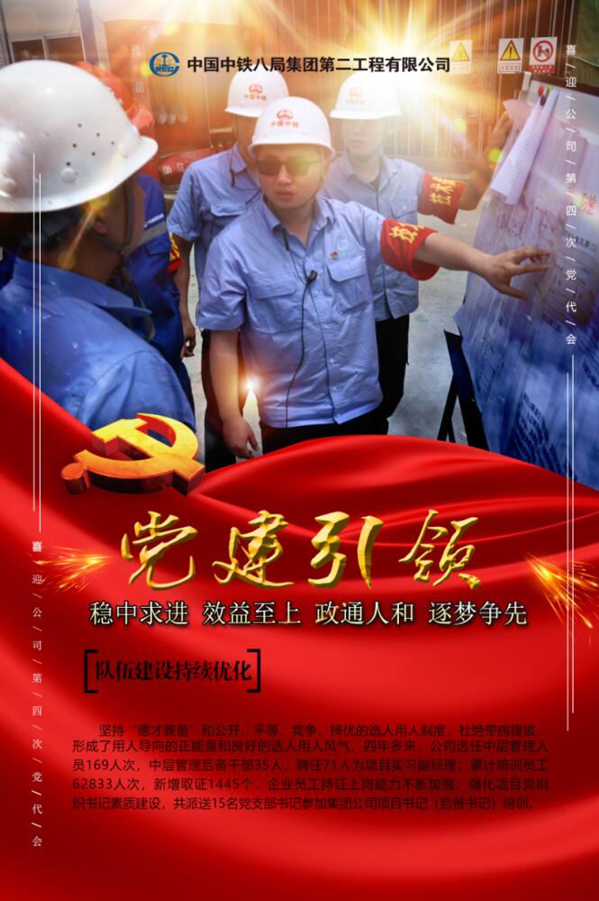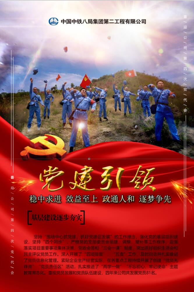 中铁八局二公司自第三次党代会召开以来的四年,围绕企业“扭亏解困、提挡升级,高质量发展”目标,全公司上下同心、锐意改革,以大力加强思想政治建设、领导班子建设、基层党组织建设、企业文化建设、党风廉政建设、和谐企业建设为重点,切实提高党组织的创造力、凝聚力和战斗力,为公司扭亏解困、深化改革、提质增效提供了坚强保证!