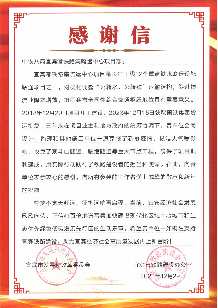 12月29日,宜宾市发展和改革委员会向中铁八局宜宾港铁路项目部发来感谢信,对项目部克服新冠疫情、极端天气等影响,攻克观斗山隧道、临港隧道等重大节点工程,确保项目顺利建成,表示衷心的感谢,向所有参建的工作者送上诚挚的敬意和新年的祝福!