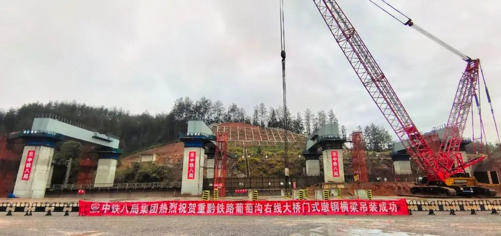葡萄沟右线大桥全长534.42米,共17个墩台。本次吊装的5号至8号“门”型墩钢横梁需上跨渝厦高铁,是全线唯一上跨既有线施工,每个“门”式墩钢横梁梁长 27.66米、宽 3.3米、高 2.8米、重量约145吨。“一辆家用小汽车的重量一般在1.5吨左右,我们此次吊装的钢横梁相当于近100辆小汽车的重量。”中铁八局重黔铁路项目部总工程师介绍道。